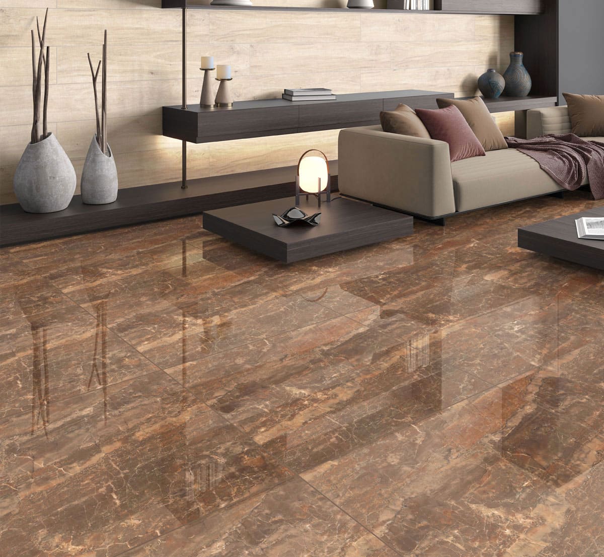 O porcelanato Bronzo Armani RT Polido 66×66 é inspirado no mármore Armani, com tonalidade marrom profunda e veios delicados que criam um visual sofisticado e contemporâneo. Seu acabamento polido espelhado realça o brilho, valoriza a iluminação e proporciona sensação de amplitude aos ambientes.